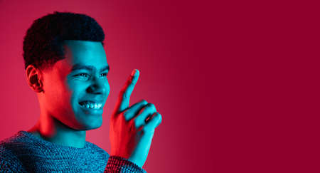 Pointing. African-american mans portrait on red background in multicolored neon light. Beautiful male model. Concept of human emotions, facial expression, sales, ad, fashion. Flyer with copyspace.