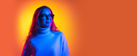 Portrait of yung smiling girl, student in warm sweater smiling, posing over orange background in neon light. Concept of youth, lifestyle. Banner, flyer
