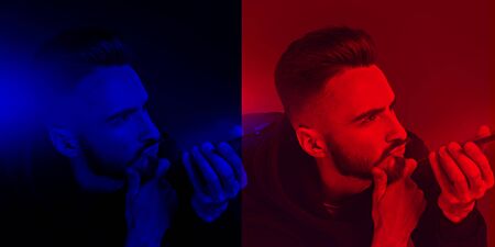 Art collage of a thoughtful man with a smartphone in his hand. A combination of red and blue light. A collage of the two monochrome colors.