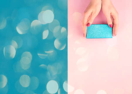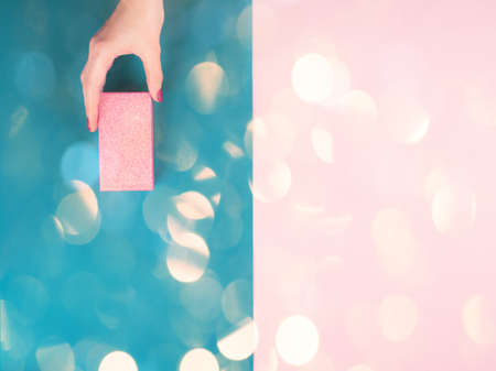 Glitter gift box in female hand on pink and AI Aqua 2021 trendy color split backdrop. Festive flat lay for Christmas, Womans day, Valentine with bokeh.
