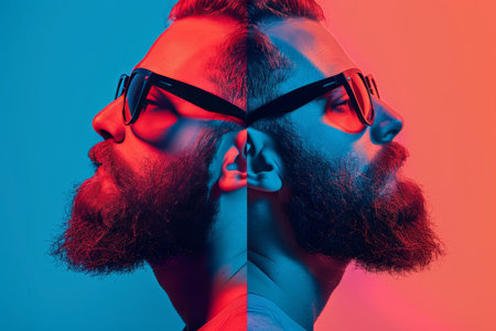bearded white man on a contrasting multi-colored background blue and red. thoughtful look