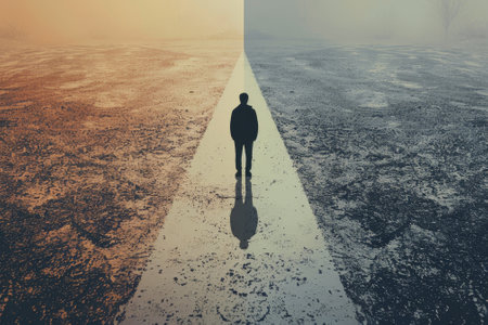Person stands at a crossroads, facing two paths. Light contrasts sharply with darkness, creating a cinematic sense of choice.