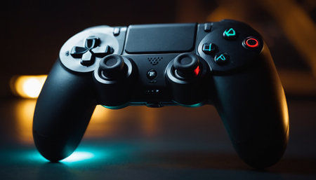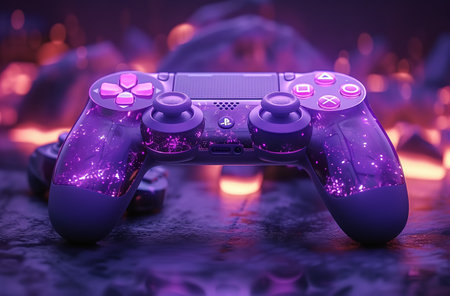 Close-up of a game controller with neon backlighting and blurred gaming icons in the background.