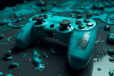 gamepad in blue and purple background. gamepad lying on a black table controller for games. game console