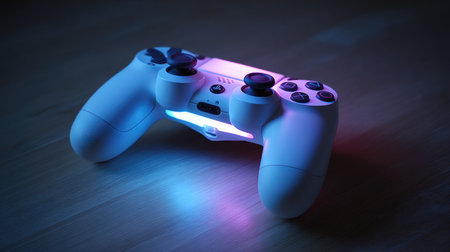 This image showcases a stylish white game controller with vibrant glowing lights on a smooth wooden surface, ideal for promoting gaming-related content.