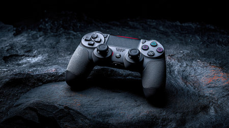 A sleek black video game controller rests on a dark, textured surface, showcasing modern design and gaming technology. Perfect for gaming enthusiasts.