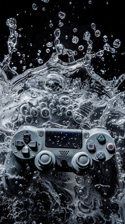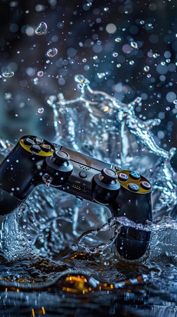 A gamepad is centered in a dynamic composition amidst an explosive background. The image presents a dark palette with fiery orange and red highlights. This dramatic scene showcases a digital representation and is suitable for various commercial uses, including gaming, technology, and entertainment.