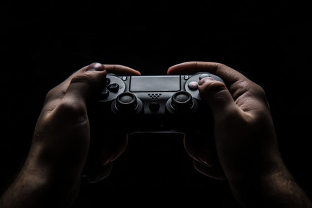 A close-up of two hands gripping a black game controller, with visible moisture on the surface. Dark background emphasizes tactile design, interaction, and gaming emotion. Ideal for product and lifestyle visuals.