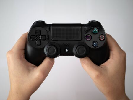 Russia, OKTOBER 24 2019: Male hands holding a PS4 controller, Sony PlayStation 4 game console.