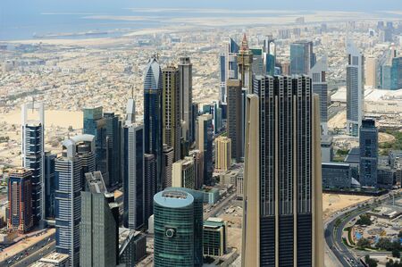 Aerial view of modern city skyscrapers in Dubai, UAE.
