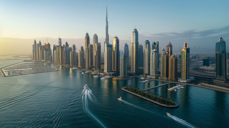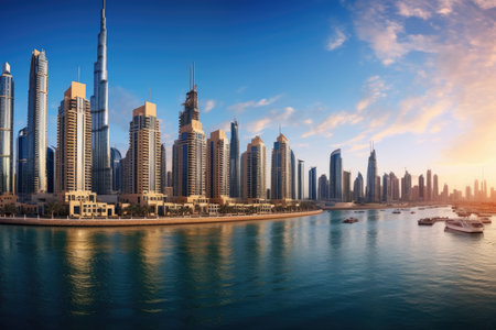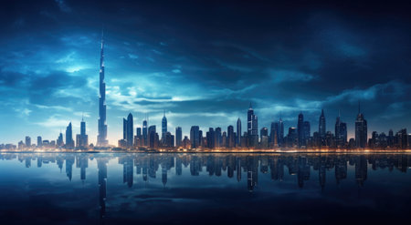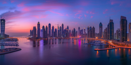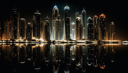 Dubai modern skyline illuminates the waterfront at dusk generated by artificial intelligence