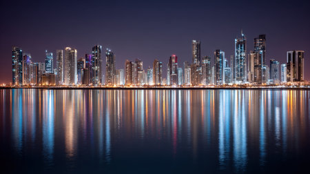 Vibrant city skyline illuminated at night with reflections on calm waters