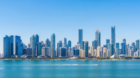 This image features a stunning skyline of a modern cityscape with numerous high-rise buildings and skyscrapers. The city is situated along a body of water, possibly a sea or a large lake, under a clear blue sky. The image is on a transparent background, making it suitable for various design applications. Key elements include the architectural diversity of the buildings and the serene waterfront setting.