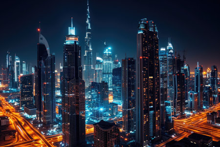 Aerial view of Burj Khalifa in Dubai Downtown skyline and highway, United Arab Emirates or UAE. Financial district and business area in smart urban city. Skyscraper and high-rise buildings at night.