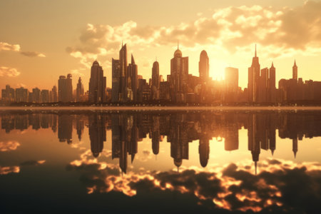 Cinematic urban skyline reflected in river at dusk with clouds and silhouettes of buildings
