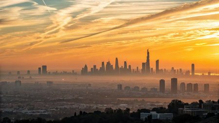 A hazy sunrise casts an orange glow over a distant city skyline, with dramatic clouds filling the sky.