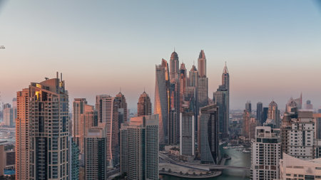 Aerial view of Dubai Marina bay at sunset, United Arab Emirates