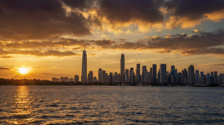 City skyline at dusk, tranquil waters, skyscrapers silhouette, serene urban sunset