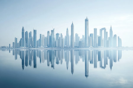 Skyscrapers of Dubai rise above the water, creating a stunning symmetrical reflection in the soft morning light.