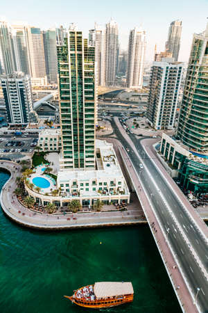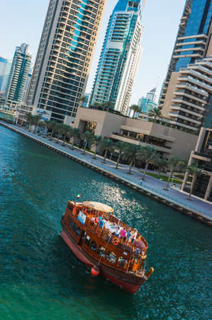 Dubai Marina, harbour, cruise boat and canal promenade view at sunset, in Dubai, United Arab Emirates