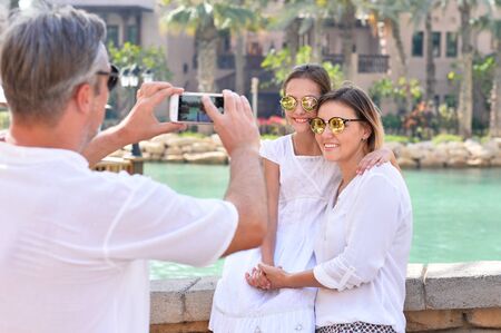 Happy family posing in city. Man taking picture of woman and girl