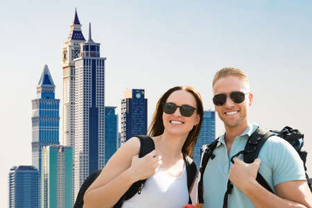 Portrait Of A Smiling Young Couple Wearing Sunglasses In City