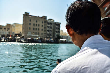 Dubai, UAE - January 6, 2020: Man relaxing by Dubai Creek watching abras sail across the water