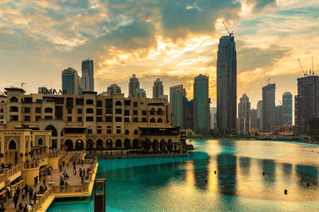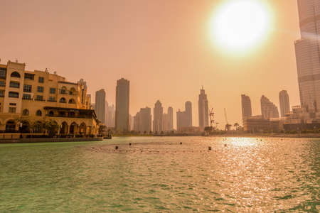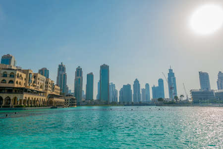 Town scape at summer. Panoramic scene, Dubai. Water Fountain lake famous place to visit in Dubai travel and Tourist attraction