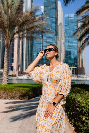 Happy beautiful tourist woman in fashionable summer white dress walking and enjoying in Dubai marina in United Arab Emirates. Luxury and comfortable tourism season in UAE. Warm summer day.