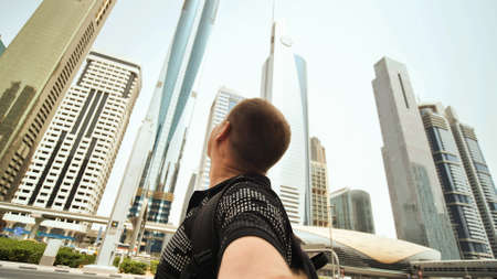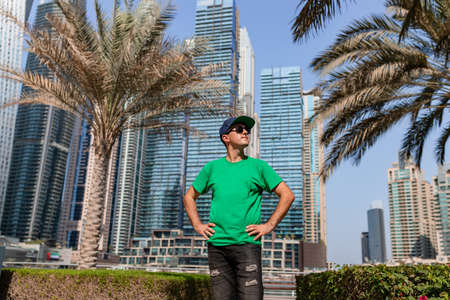 Attractive traveler man walking on a promenade in Dubai Marina district. Travel destinations and tourist lifestyle in UAE