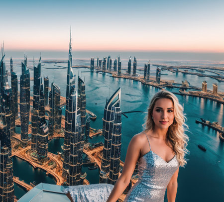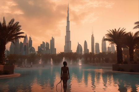 Woman enjoying Dubai landmark view at sunset