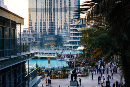 DUBAI, UAE - DECEMBER 12, 2018: Tourists and local people near Mall of Dubai. Tourist attracting Burj Khalifa. Busy tourist attraction area. Travel vacation concept