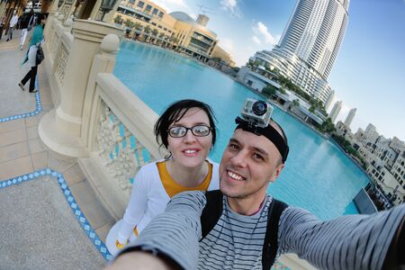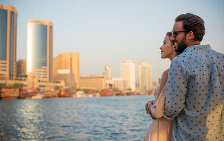 Happy couple spending time in Dubai. man and woman wearing traditional clothes taking a cruise on the river