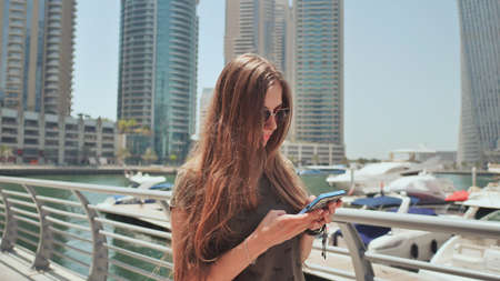 A girl with long hair dials a message on the smartphone at the quay of Dubai Marina.