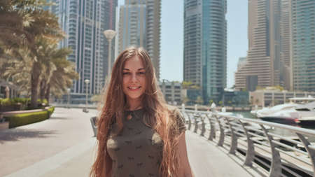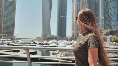 A young girl with long hair and a good mood walks along the embankment of Dubai Marina.