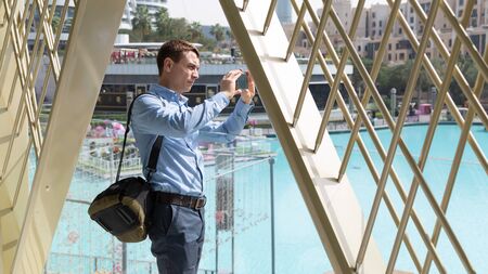 Tourist with a large smartphone in his hands on an excursion. A man photographs local attractions of country.