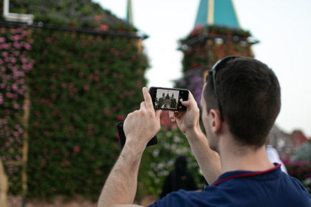 Young adult tourist with dark hair taking photos on his smartphone outdoor in the park at daytime