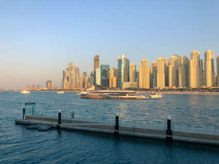 Dubai, UAE United Arabs Emirates - 29 May, 2019: Panoramic view of Dubai skyscrapers at the coast. Skyscrapers, modern architecture Dubai marina