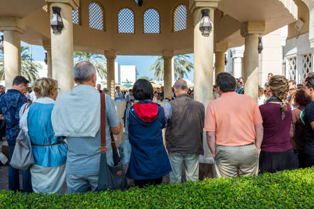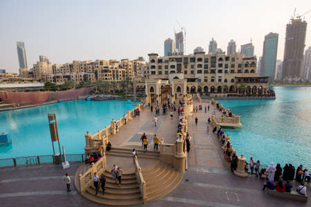 Dubai, United Arab Emirates - March 26, 2018: People gather around the Dubai mall fountain to see the water show which attracts many tourist every day