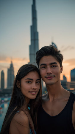 Romantic Couple Enjoying a Beautiful Sunset with City Skyscrapers in the Background Captured in a Stunning Urban Landscape AI Generative