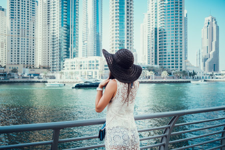 Happy beautiful unrecognizable tourist woman in fashionable summer white dress enjoying in Dubai marina in United Arab Emirates. Luxury and comfortable tourism season in UAE.