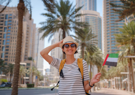 Enjoying travel in United Arabian Emirates. Young woman with yellow backpack with the flag of the United Arab Emirates walking on Dubai Downtown in sunny summer day.