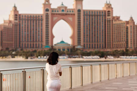 Dubai, UAE, November 2019 Girl station in background de Atlantis hotel in artificial ibus insula palma Jumeirah, travel