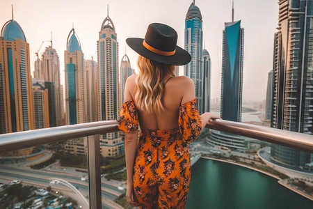 Back of woman in hat enjoying Dubai skyline with skyscrapers architecture from luxury hotel. Trip in United Arab Emirates. Generative AI.