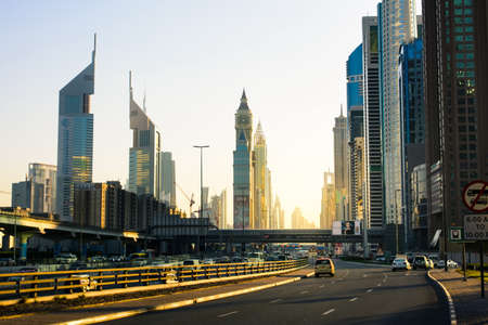 DUBAI, UNITED ARAB EMIRATES - NOVEMBER 21, 2019: Sheikh Zayed Road view with modern skyscrapers and traffic in a cloudy day