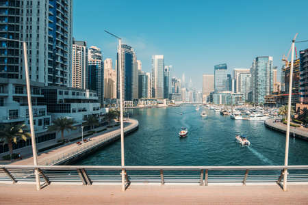 Luxury Dubai Marina canal in Dubai with high buildings at background, United Arab Emirates, view from one of bridges.