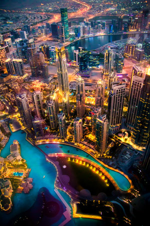 Aerial view of Burj Khalifa in Dubai Downtown skyline and highway, United Arab Emirates or UAE. Financial district and business area in smart urban city. Skyscraper and high-rise buildings at night.