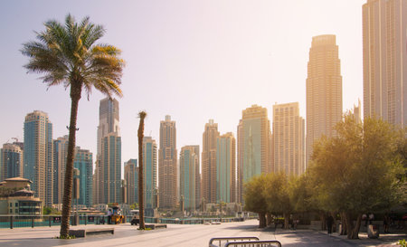 Dubai; UAE - June 6, 2020: Dubai Marina promenade with residential buildings, offices, hotels, yachts and boats early in the morning