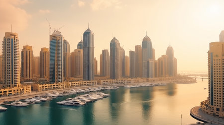 Modern skyscrapers in Dubai Marina with reflection on calm water, ample copy space