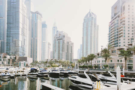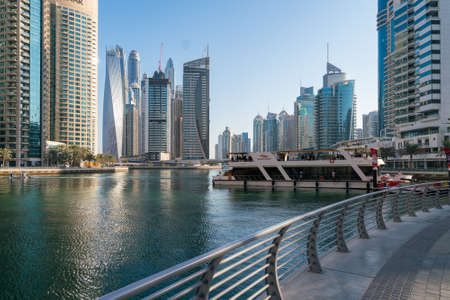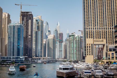 Dubai, UAE - 11.03.2017: Skyline of Dubai Marina on a hot day with clear sky. Skyscrapers, bay, boats, people walking by the water.
